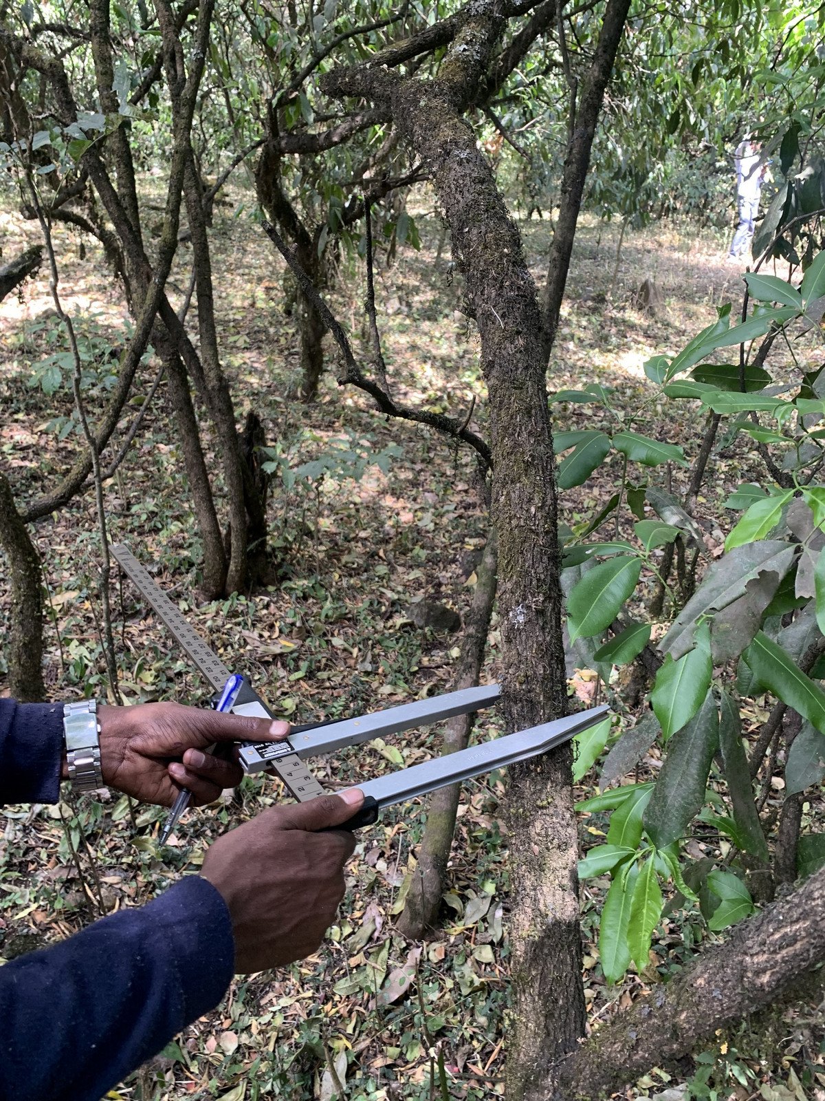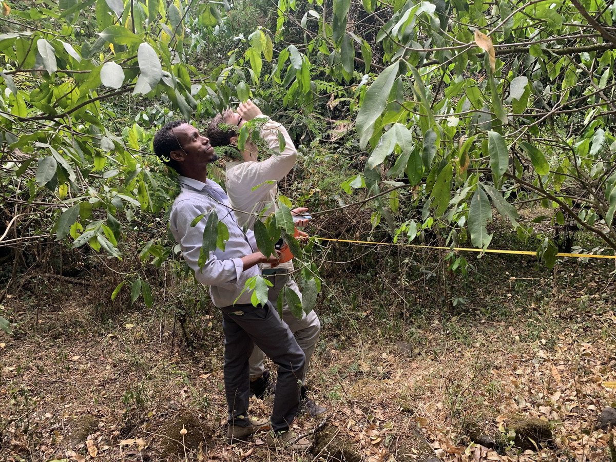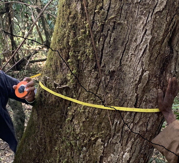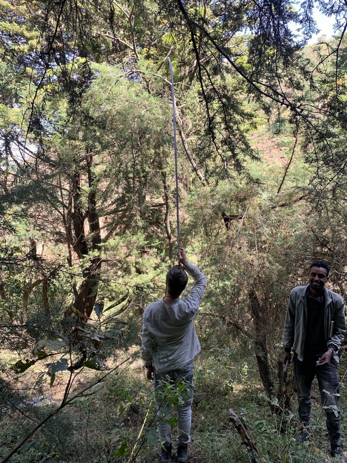 Mit Maßbändern und Seilen stecken wir in den kommenden Wochen insgesamt 30 runde Untersuchungsflächen mit einem Radius von 15 Metern ab, sogenannte Plots. Wir bestimmen die vorkommenden Arten, zählen die Individuen – der Begriff für einen einzelnen Baum - und notieren die Störfaktoren, wie Beweidung, Fußpfade oder Holzeinschlag. „Aufgrund der hohen Anzahl an endemischen Arten sind Vegetationsuntersuchungen in äthiopischen Wäldern besonders wichtig und können zur Erhaltung der Artenvielfalt beitragen“, erklärt unser Botaniker Solomon Girmay. Zusätzlich vermessen wir den Brusthöhendurchmesser sowie die Höhe der größeren Bäume.