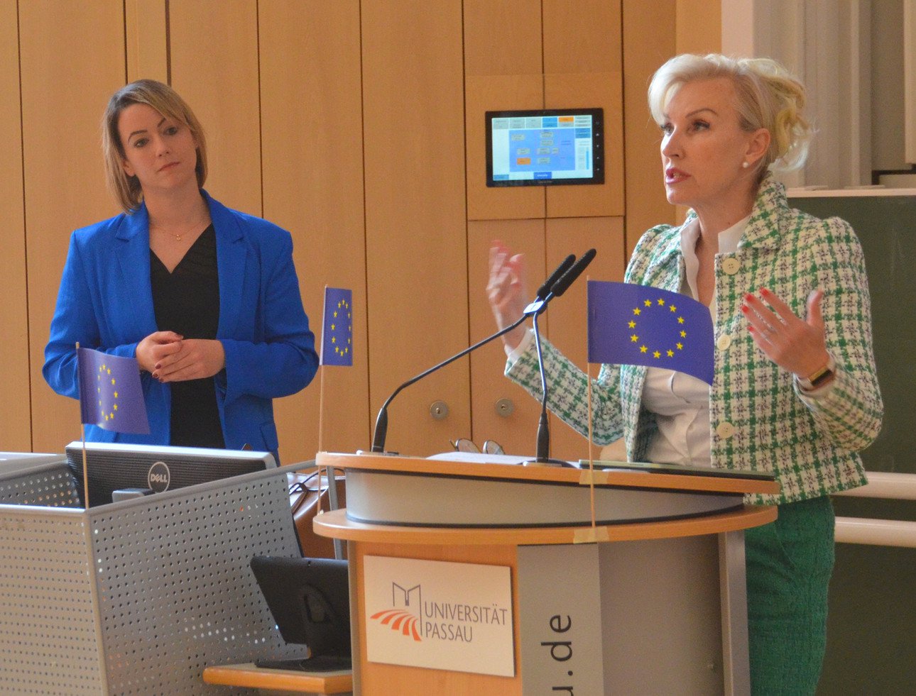 Von Geopolitik ist die Rede, wenn es um die veränderte sicherheitspolitische Lage in Europa geht - speziell seit Beginn des russischen Angriffskriegs auf die Ukraine. Der Begriff bezeichnet ein altes politisches Denken in Macht und Einflusssphären. Die Europäische Union hingegen tue sich schwer mit dieser Form von Außenpolitik, wie Prof. Dr. Daniel Göler, Inhaber des Jean-Monnet-Lehrstuhls für Europäische Politik auf einem Podium an der Universität Passau anlässlich des Europatags ausführte: „Geopolitik widerspricht der historischen Linie der Europäischen Union.“ Denn diese sei als Friedensprojekt unter der Prämisse „Nie wieder Krieg“ geschaffen worden. Der französische Außenminister Robert Schuman habe in seinem Plan einen integrativen Ansatz gewählt – unter Einbindung Deutschlands.