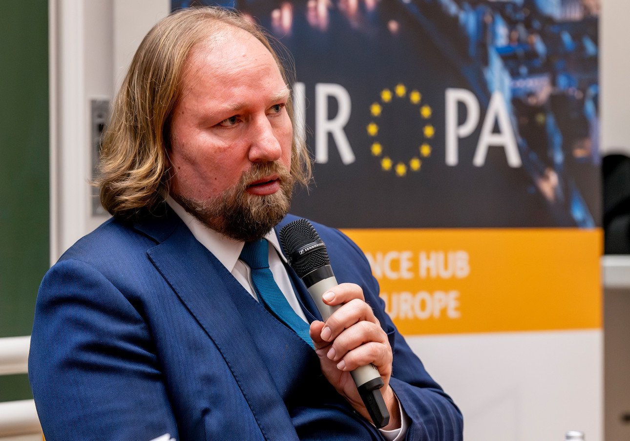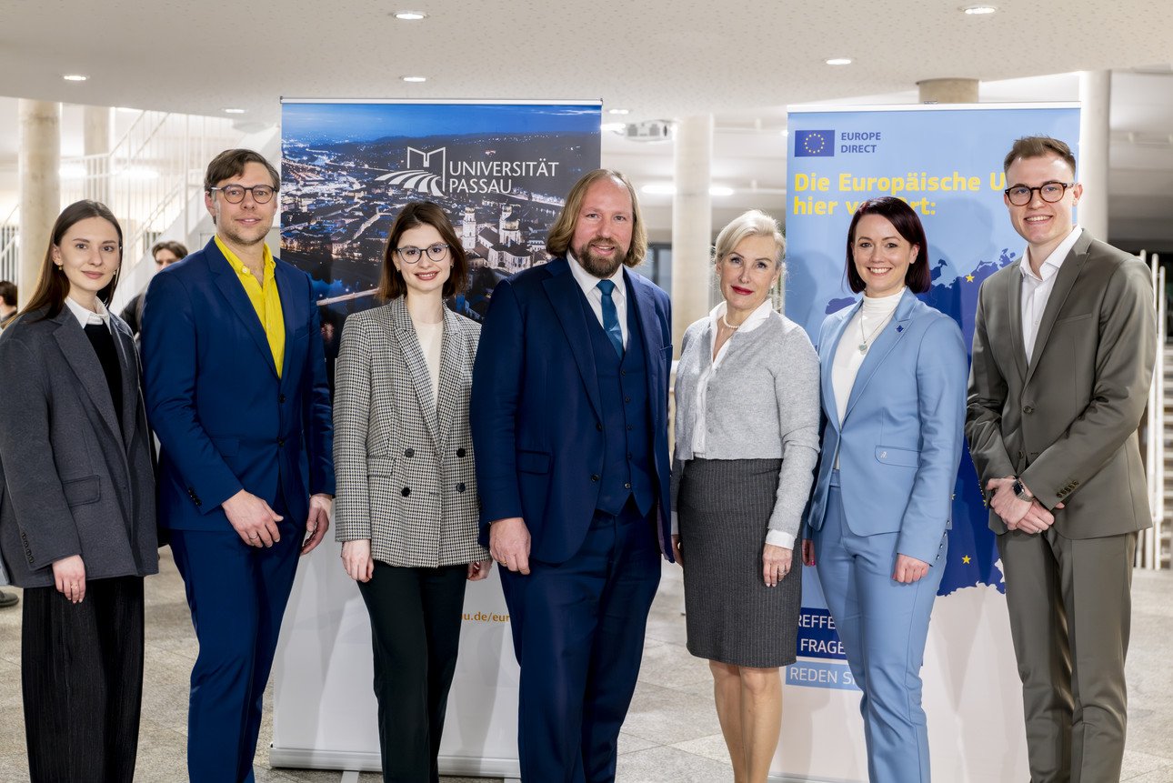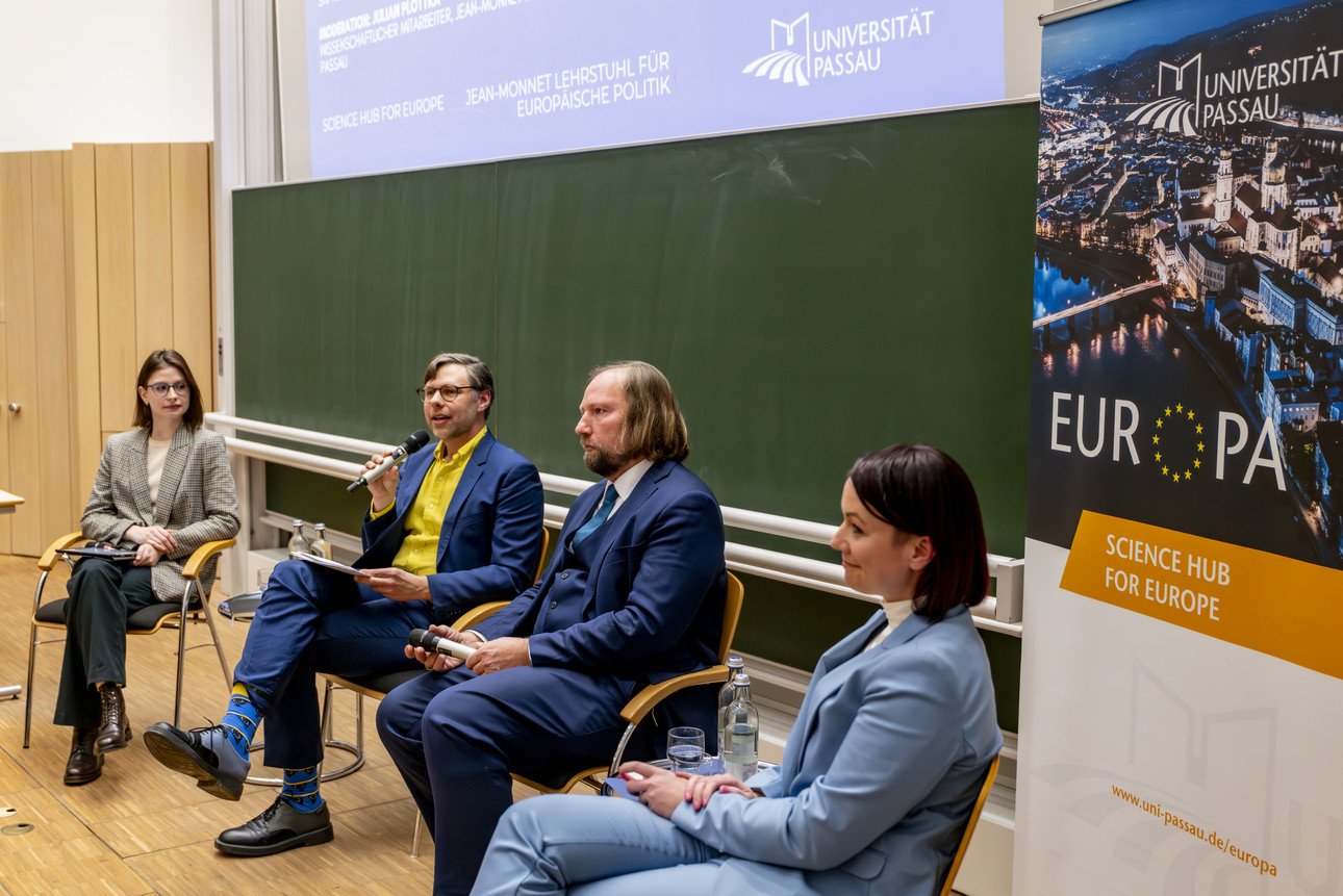 Die von Julian Plottka für den Jean-Monnet-Lehrstuhl für Europäische Politik und Florence Ertel für den Science Hub for Europe organisierte Veranstaltung mit dem Titel „Trump 2.0: Wirklich ein Weckruf für die Sicherheits- und Verteidigungspolitik der EU?“ zielte drauf, die deutsche Sicht auf die aktuelle Debatte kritisch mit der französischen und tschechischen Perspektive zu kontrastieren. Den mehr als 250 Teilnehmenden, die der Einladung in die Universität Passau gefolgt waren, bot sie zudem einen Einblick in die hiesige Forschung zur Gemeinsamen Sicherheits- und Verteidigungspolitik (GSVP). So unterstrich die Vizepräsidentin für Internationales, Europa und Diversity der Universität Passau, Prof. Dr. Christina Hansen, in ihrer Begrüßung die Bedeutung des Themenschwerpunkts Europa für die gesamte Universität. Diese biete öffentlichen Diskussionsraum für alle Interessierten und für die zahlreichen Studierenden im Publikum eine praxisorientierte Bereicherung der universitären Lehre.