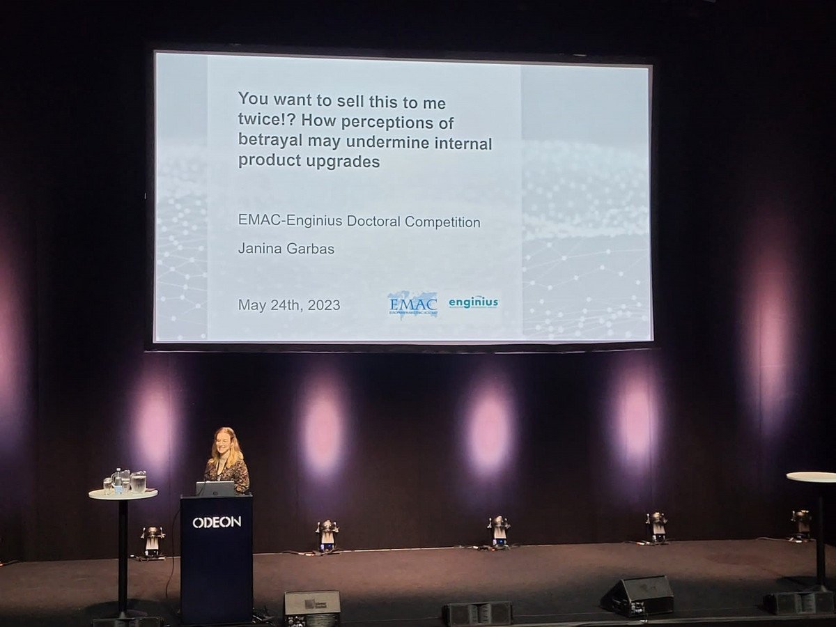 The researcher analyses questions like this one and others in her doctoral thesis entitled "From Now to Next – Three Essays on Consumer Responses to Innovative Technology-Driven Business Models". As one of three finalists, she presented the insights of her main essay entitled "You want to sell this to me twice?! How perceptions of betrayal may undermine internal product upgrades" to the jury at the annual conference of the European Marketing Academy (EMAC) held in the Danish city of Odense in May and came second in the "EMAC-Enginius Doctoral Competition 2023" for early-stage researchers. In June, at this year's "Frontiers in Service" conference in Maastricht, the jury of the "SERVSIG Best Dissertation Awards in Service Research" announced that they had selected her as a finalist as well. EMAC is Europe's most important professional society for marketing theory and research. The "SERVSIG Best Service Dissertation Award" is one of the world's most reputable awards for early career researchers in services research.